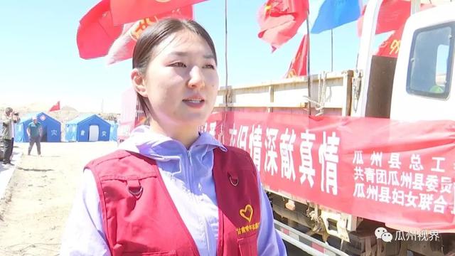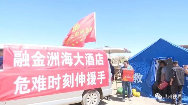 瓜州县融金洲海大酒店副总经理 王琴:“融金洲海大酒店组织员工给灾区人民送来了日常生活的一些卷纸、洗脸盆,牙刷,香皂之类的用品,希望能够给灾区人民尽一点微薄之力。”