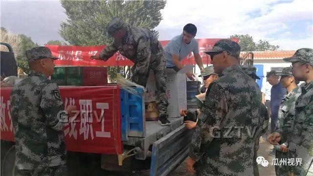 瓜州县总工会组织捐款1300元,支援灾区群众重建家园,筹措资金10000元,购买矿泉水、方便面、西瓜等防暑生活用品,看望慰问奋战在一线的武警官兵和职工群众。