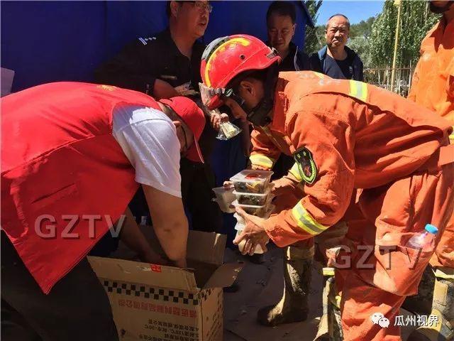 灾害无情、人间有爱。7月9日,在锁阳城镇东巴兔村洪涝灾害现场,长乐宾馆的工作人员正在为武警战士、消防员和公安干警发放盒饭,支援灾区群众抗险救灾。