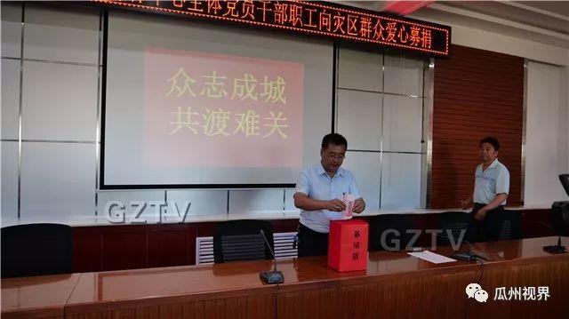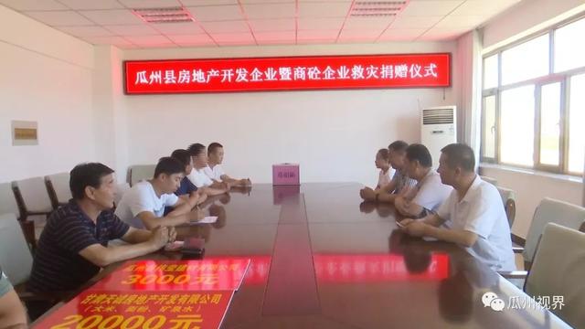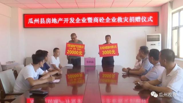 7月9日,甘肃天诚房地产开发有限公司捐助20000元的爱心物资,瓜州县伟莹建材有限公司捐助现金3000元,支援灾区群众恢复生产,县电信局捐款4500元。