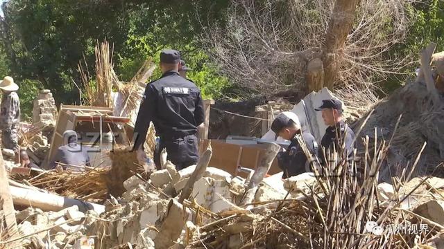 公安、武警、消防、党员干部群众在街道上、废墟上忙碌着。挨家挨户帮助受灾群众清理院落,搜寻财产,转移物资。装满家具、物资的车辆来回穿梭。大型机械轰鸣着,一户户危房被拆除。