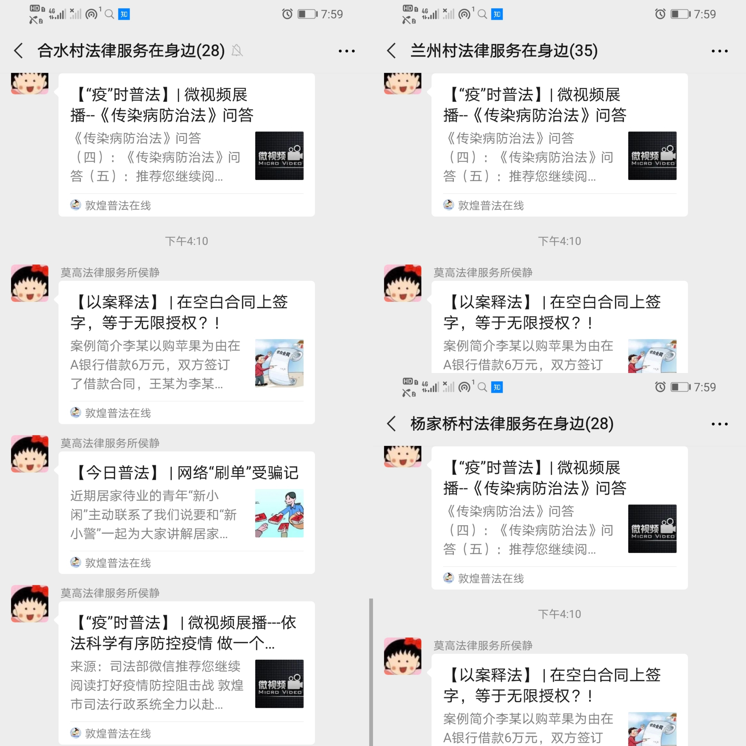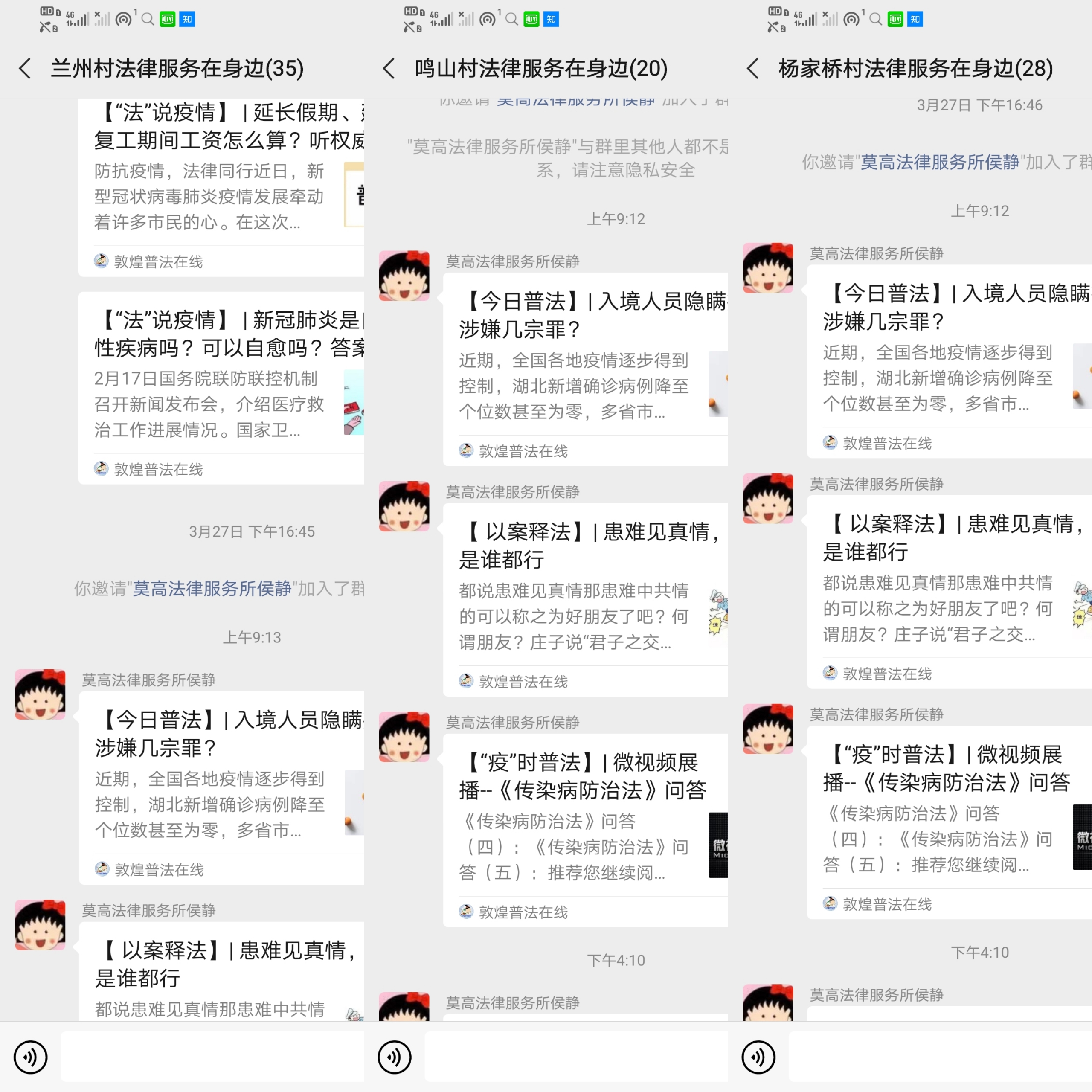 为进一步提升村法律顾问工作的公众知晓度,方便快捷地将法律知识传递到每一名群众手中,切实有效提升辖区群众依法办事的意识和能力,敦煌市司法局月牙泉司法所在各村建起法律服务微信群,吸收村法律顾问、基层法律服务工作者、人民调解员加入微信群,发动普法志愿者和热心群众300多人参与,有效构建起多层级树状普法服务网络,强效畅通公共法律服务“高速路”。