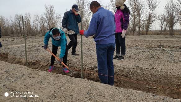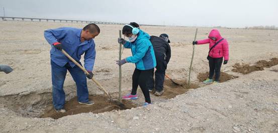 “大地植绿”“心中播绿”。3月31日,春季义务植树现场100余人参加了植树活动,两人一组或三五人搭档,有的抡锄刨坑、有的挥锹培土、有的扶正树苗、有的压实土层,分工协作,合力栽下新疆杨、毛柳、红柳、沙枣等一株株树苗,共同为建设玉门添新绿。据悉,在玉门市柳河镇官庄子玉布路的裕盛公司这个市级植树点1000亩,栽植近7万株。