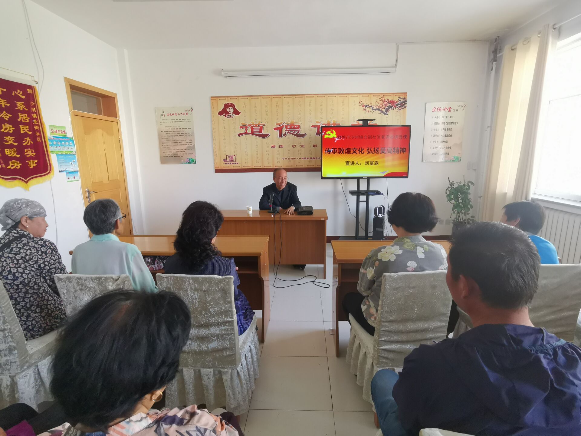 6月11日北街社区邀请退休教师、老党员刘富森同志以《传承敦煌文化、弘扬莫高精神》主题为社区全体党员上党课,讲述了“敦煌女儿”樊锦诗的事迹及如何加强党性修养、履行党员义务党课,刘富森生动细致的宣讲,把敦煌文化展现出的向上向善的正能量传递给了在座的每一位党员,引导党员们带头做好敦煌文化的传承人。