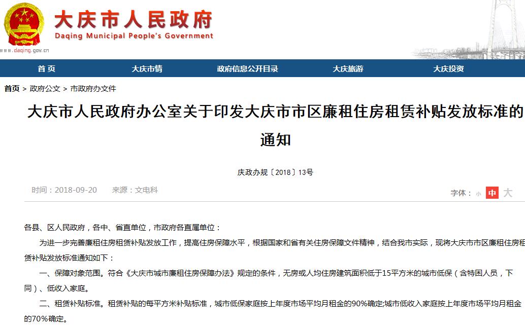 2018年9月20日,大庆市人民政府发布《大庆市市区廉租住房租赁补贴发放标准》(以下简称《发放标准》),表示今后市区廉租房租金标准价格将随市场情况调节,住房、租房补贴标准均有不同幅度的提高,我市相关部门将统一组织测算,并每年定期公布市场平均月租金标准,确定具体补贴金额。
