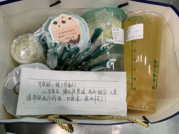 近日,市场南门刘阿晶奶茶店负责人俞露为值守在瓜州县火车站疫情防控卡口的渊泉镇干部送来了暖心的奶茶,并附上了真诚的祝福语,希望能为抗击新型冠状病毒感染的肺炎尽一点儿绵薄之力。 “看到你们防控卡口的值守人员不怕危险,舍小家、为大家,辛苦付出,战斗在防控一线,我非常感动,也想尽一份绵薄之力,虽然东西不多,我愿用自己的一份爱心保一方平安。同时,我也希望你们一定要保护好自己,做好个人防护措施”。刘阿晶奶茶店负责人俞露说。