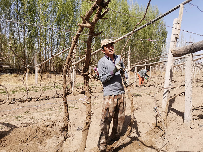 在敦煌市转渠口镇马福彦家庭农场的葡萄园中,工作人员正小心翼翼地将已沐浴春光的葡萄藤蔓理顺上架,呈现出一派繁忙的葡萄放藤景象。“起挖葡萄藤是葡萄春季管护重要环节,由于北方天气寒冷,需在冬灌之前将葡萄藤修剪埋入土中,等次年清明前后再起挖‘上架’,既能确保葡萄安全‘越冬’,又能促进果苗花芽分化。出土太早容易受霜冻,出土太晚葡萄发芽不能及时出土,影响当年的产量,所以葡萄出土环节是我们葡萄管理中最重要的环节,4月20日之前要全部出土完成。”镇农林牧负责人王朋说。