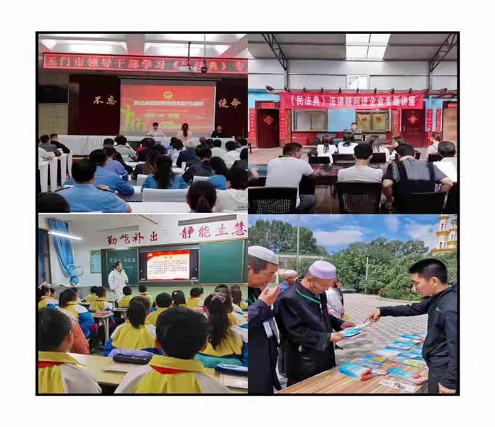 抓好《民法典》落地生根。坚持常态化、精准化、品牌化理念,将民法典宣传教育与司法为民深度结合,开展“美好生活.民法典相伴”主题法治宣传活动,印发民法典宣传图册。今年以来,由律师、法律服务工作者组成的宣讲团开展“送民法典”进机关、进乡镇、进社区、进宗教场所专题讲座12场次;各基层司法所结合所在乡镇举办的夏季农民文化艺术节开展民法典专题普法宣传活动18场次,“玉门普法”抖音号宣传讲解民法典11期,营造了民法典学习教育的浓厚氛围,真正把民法典送到群众身边,深入群众心中。