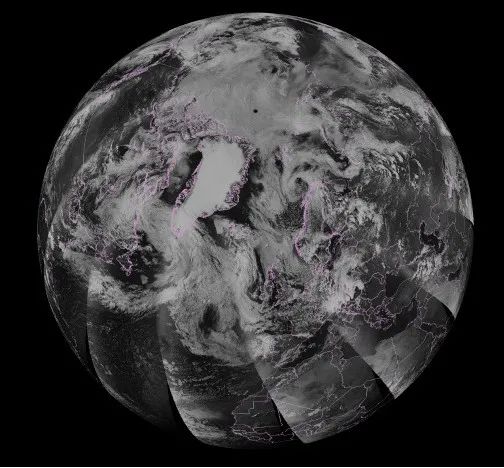 卫星图像中极地气旋、格陵兰岛的积雪等清晰可见。