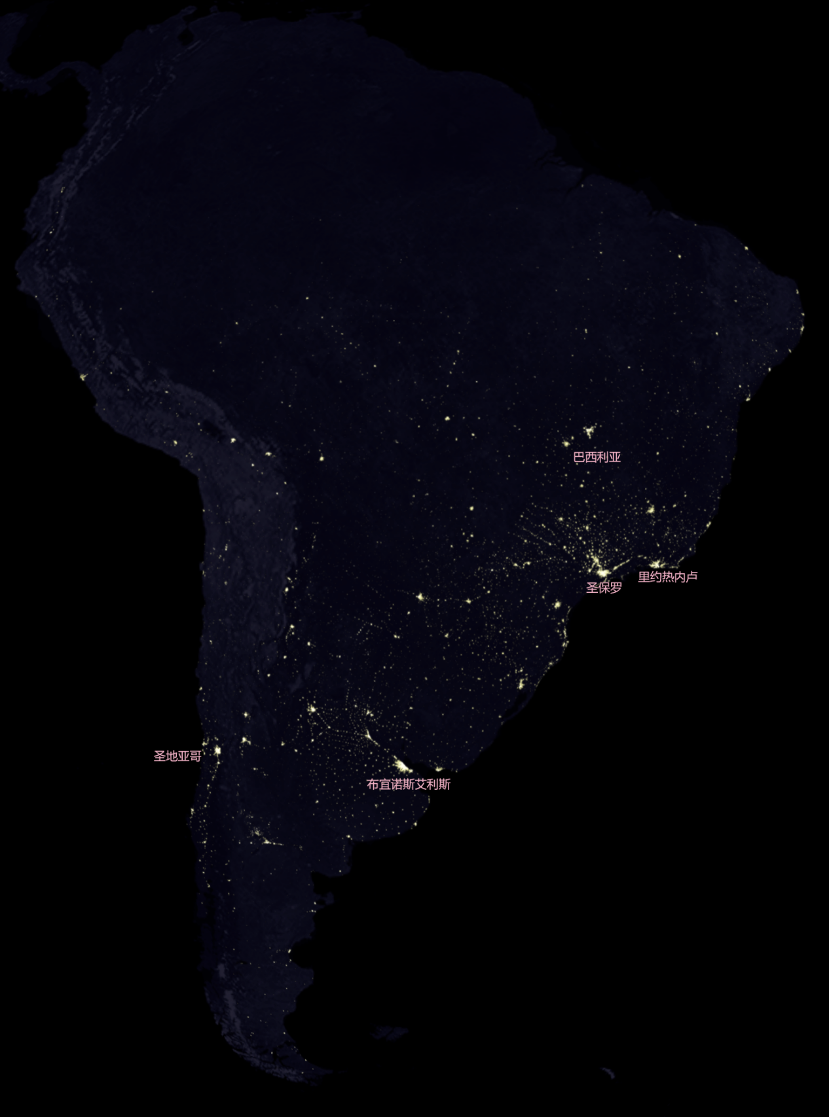 巴西圣保罗和阿根廷的布宜诺斯艾利斯是南美洲第一和第二大城市,二者亮度不相上下,且灯光面积和亮度明显比中小城市更大更明亮。