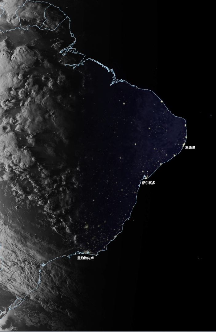 而与此同时,东边已是灯火通明,城市的灯光在黑夜里熠熠生辉。里约热内卢、巴西利亚、圣保罗等巴西大城市清晰可见。