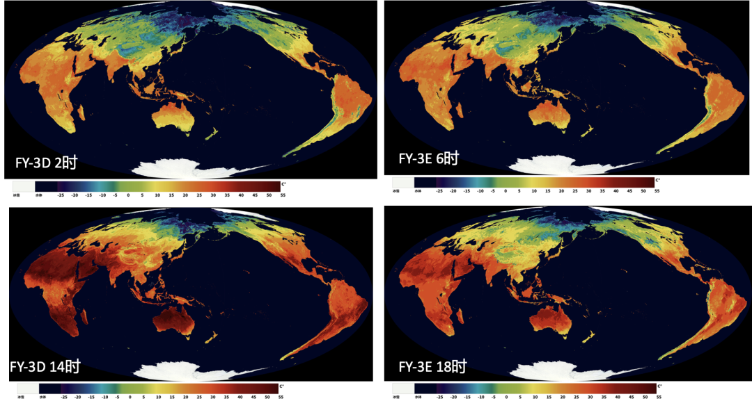▲2021年10月全球地表温度产品。风云三号d、e两颗卫星获得的全球昼夜与晨昏四个时刻的地表温度,可以形成观测时间链。图中暖色表示温度高、冷色表示温度低。
