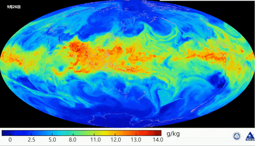 ▲风云三号e星全球大气湿度场时间演变(2021年9月11日-26日,黎明时刻,850百帕)。