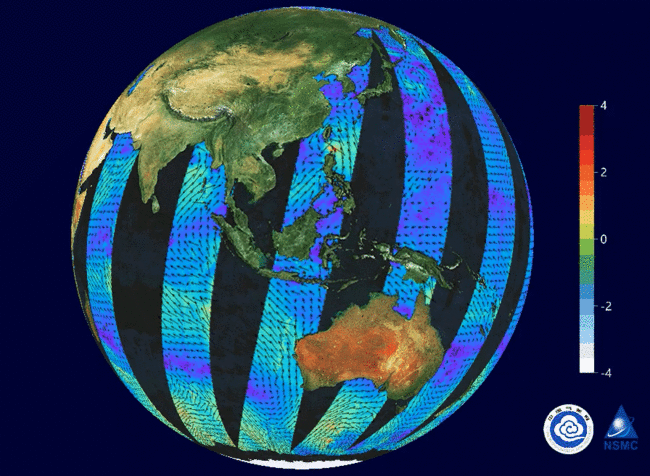 ▲风云三号e星台风结构三维探测 (2021年9月10日黎明时刻,“灿都”台风洋面风场和暖心结构)。