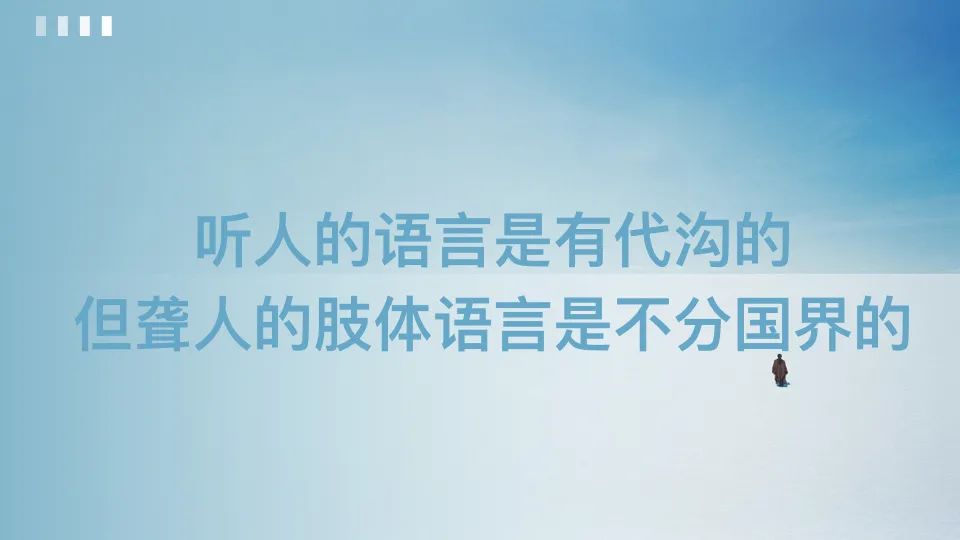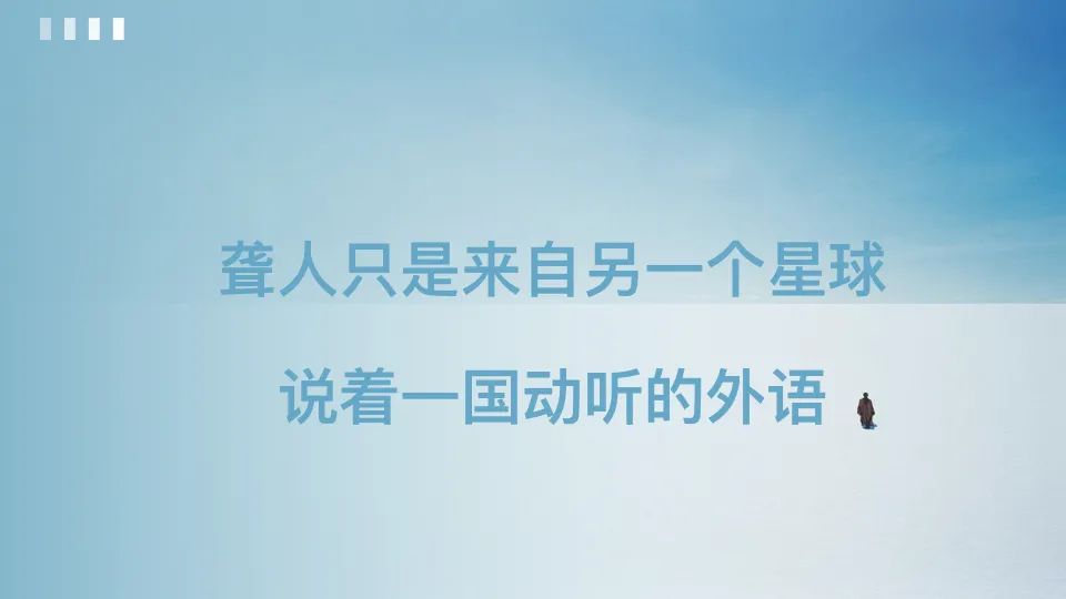 著名的哲学家留基伯说,万物的产生都有其根源都是必然的!那么我愿意相信,聋人是来告诉我们如何让我们的生活不再复杂。聋人的世界并没有太糟糕,只是与我们有一点不一样而已,他们只是来自另一个星球说着一国动听的外语。