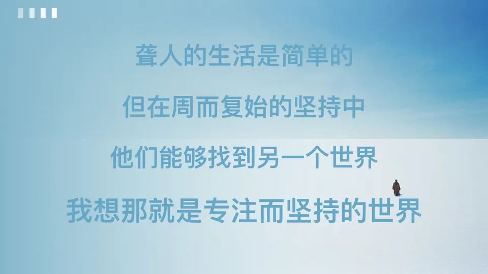 聋人因为先天条件的限制使他们生活在一个相对单纯的环境里,但这正好促使他们保持了自己的本真。他们的存在更像一面镜子,为我们呈现了一个返璞归真的生活方式,他们的世界很简单,我们的世界很复杂,他们很专注,我们很浮躁,不是我帮助了他们而是我们互相帮助了对方,我从他们身上学习到了更多的简单和纯粹。