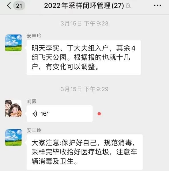 采样组组长安丰玲,一名共产党员,在采样闭环管理期间,她工作认真负责,积极主动与社区网格联络员对接采样工作,提前掌握采样任务和要求,给采样组成员分配采样任务,安排采样需要的物资领取、发放事宜。每天采样任务完成后,她认真总结当天采样工作中发现的问题,及时通过钉钉群对大家进行指导,同时认真清点剩余物资,及时对接补充第二天需要的防护用品和采样物资,默默做好大后方的后勤保障。