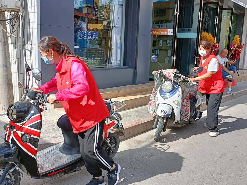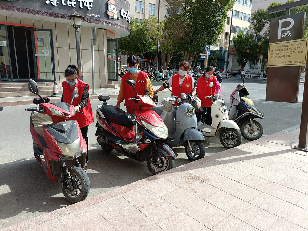 整治活动现场,社区志愿者将高台巷巷道两旁随意停放电动车推到指定停放点摆放整齐,同时向群众积极宣传文明骑行、有序停放的重要意义,引导电动车车主将电动车摆放到指定的停放区域。